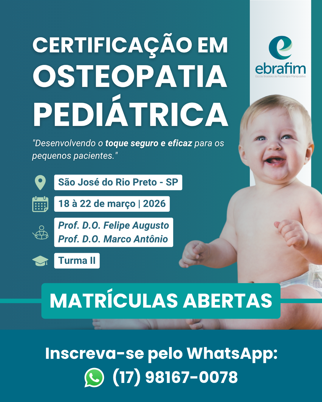 * DESTAQUE: os alunos participantes farão atendimentos práticos durante todo o decorrer do curso, reforçando muito a segurança do Fisioterapeuta Osteopata em trabalhar diretamente com crianças e bebês. Esta é uma oportunidade de ampliar um novo campo dentro da Osteopatia, capaz de proporcionar resultados surpreendentes aos pacientes.
